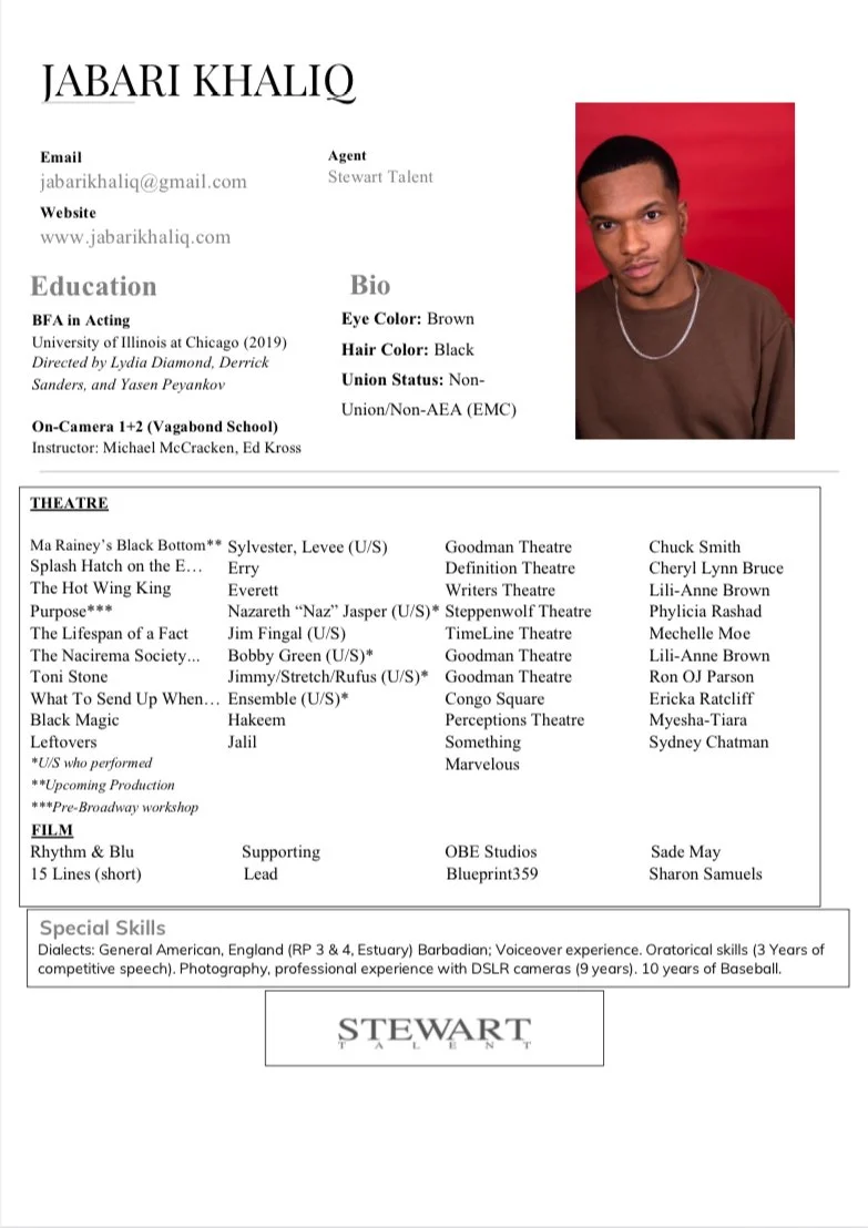 (Click for PDF Link) RepresentationStewart TalentHeight5’ 8"Weight160 lbsHair ColorBlackEye ColorBrown For all bookings contact JABARIKHALIQ@GMAIL.COM